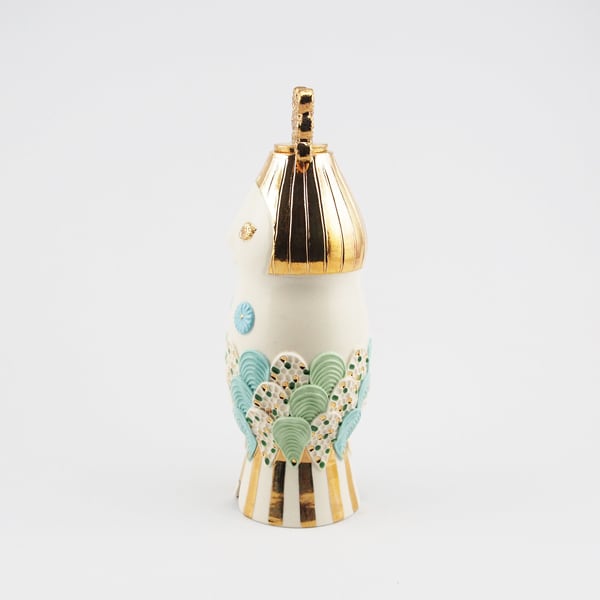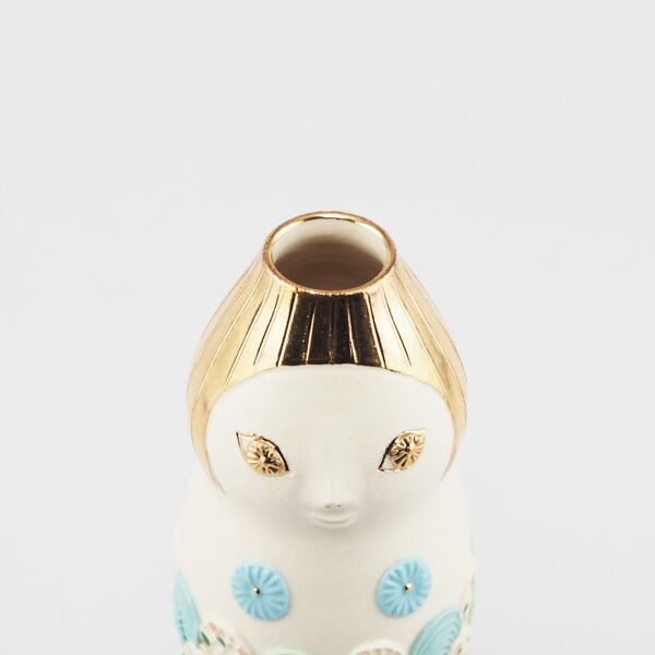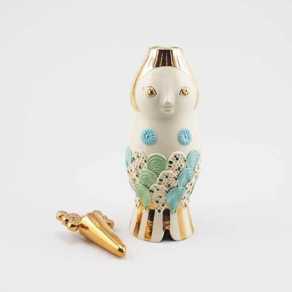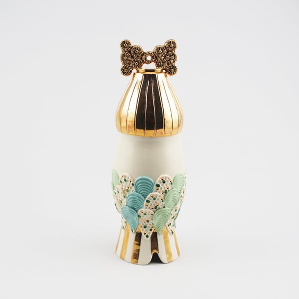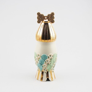 広島の陶芸家、渡邉陽子さんのマーメイドタマネギガールの飾蓋付小壺です。フラワーベースとしてもお使いいただけます。